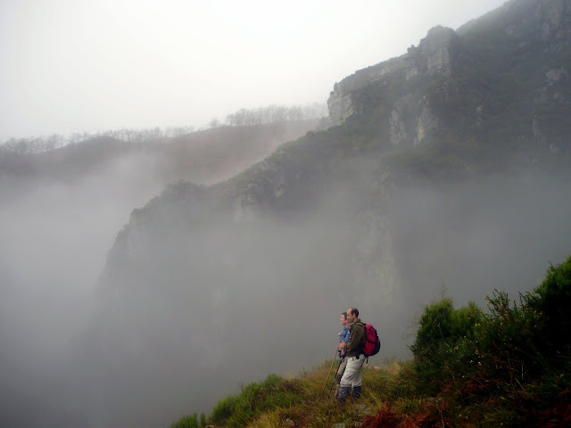 Desde la bajada la niebla nos da un respiro y vemos los prados de Aviados y la agreste foz que forma el rio Corbelloso.
