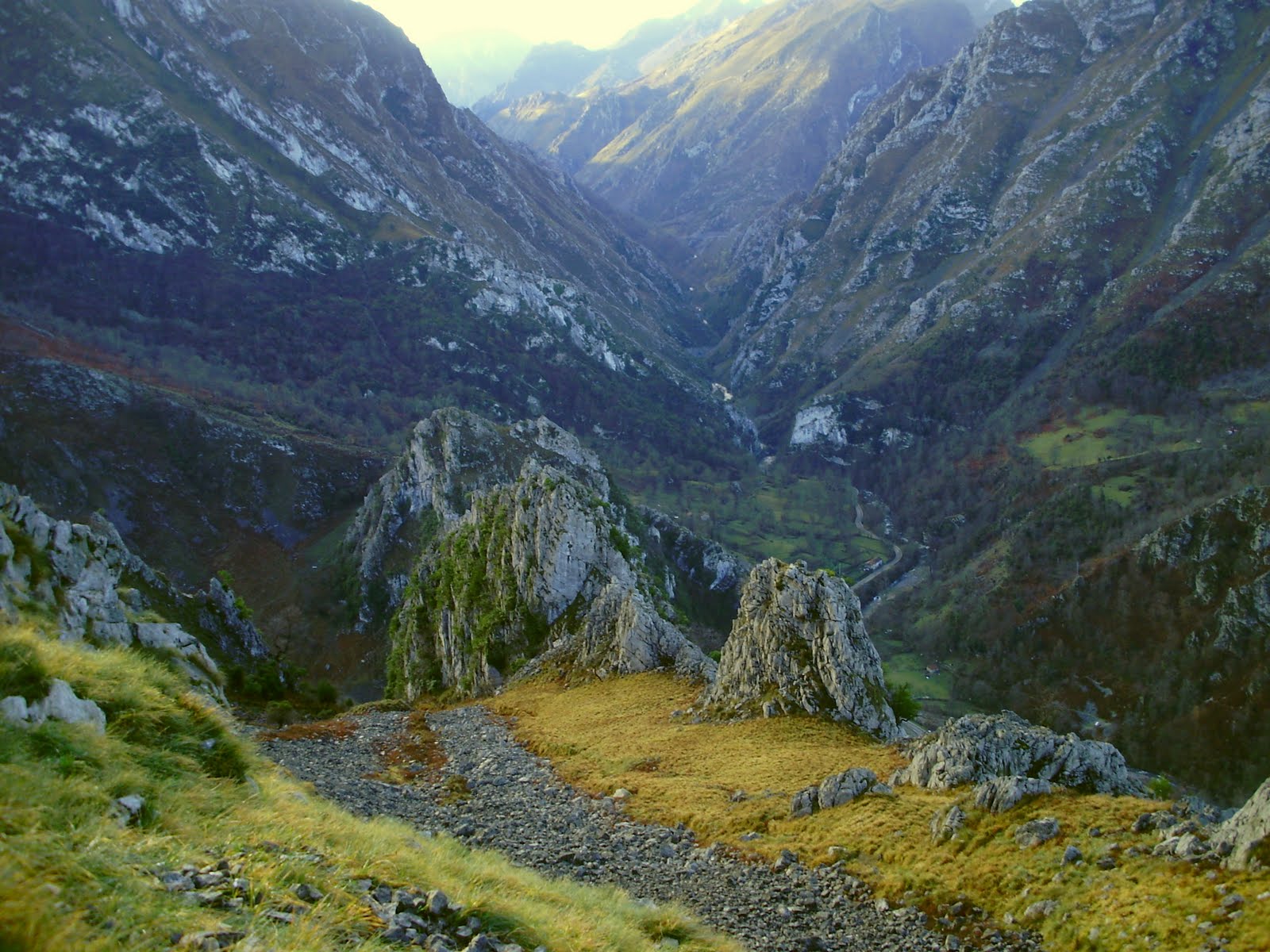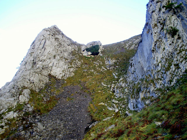 Al cruzarlo damos vista en la otra vertiente al valle del Sella y vemos claramente  la unica posibilidad de continuar nuestro avance, que es el bajar por esta canal que vemos en la foto.