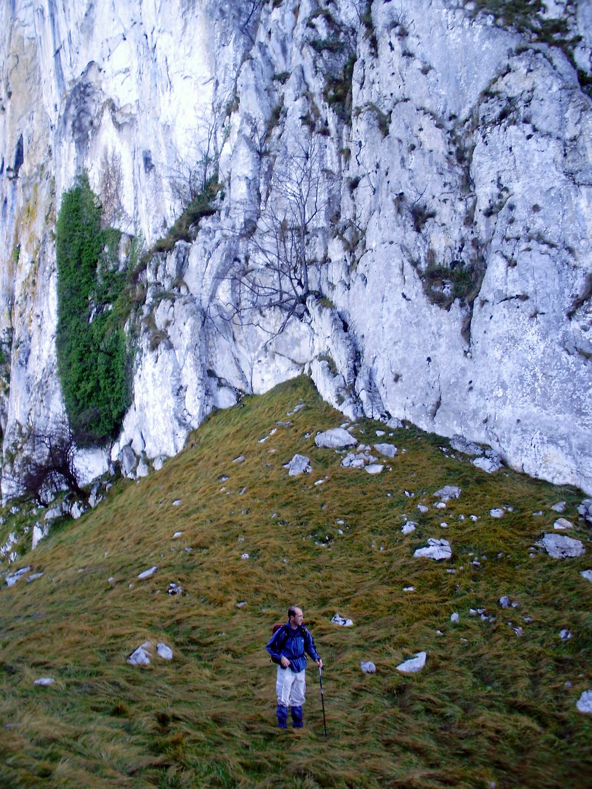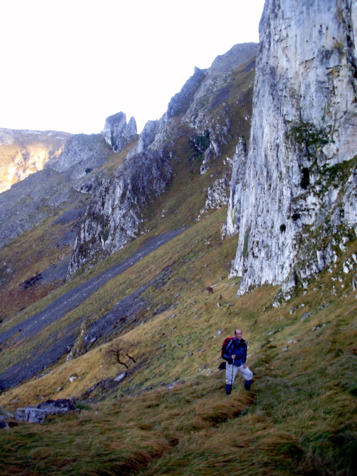 A partir de este punto y siempre cercanos a los contrafuertes rocosos, iremos avanzando en horizontal por estas pendientes herbosas ayudados por pequeñas veredas dejadas por el transitar de las cabras, es conveniente hallar estas veredas ya que hemos de cruzar alguna pedrera que por estos pasos del ganado se halla más asentada, facilitandonos el atravesarlas.