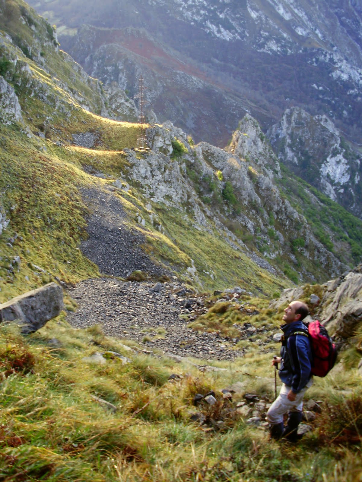 Ya que nuestro objetivo no es descender, desde este collado hemos de girar a nuestra izquierda dirección este (E), doblar el canto lateral de la cueva y  entrar en una canal herbosa bastante pendiente que pasa bajo los cables del tendido eléctrico, en dirección a un collado que tenemos por encima nuestra y que tiene como referencia clara, un poste electrico colocado en dicho collado.