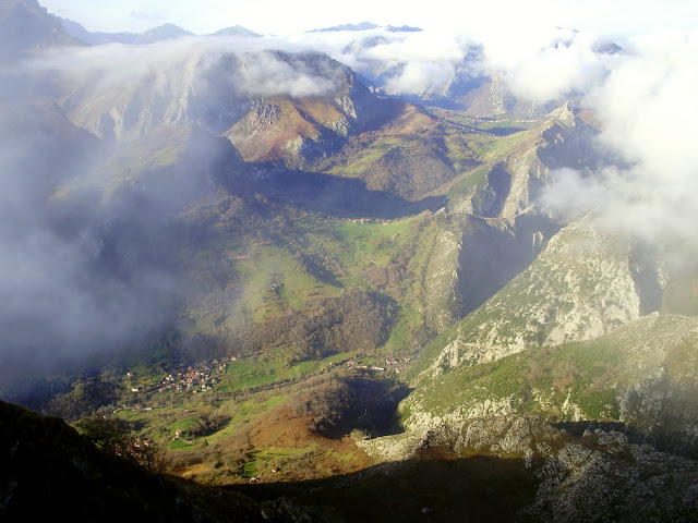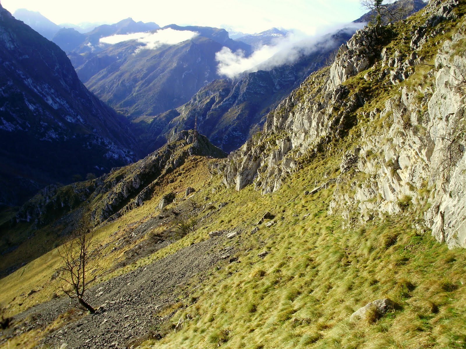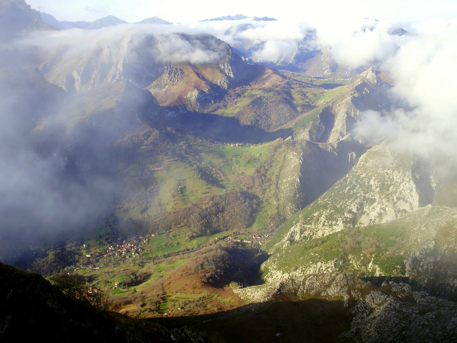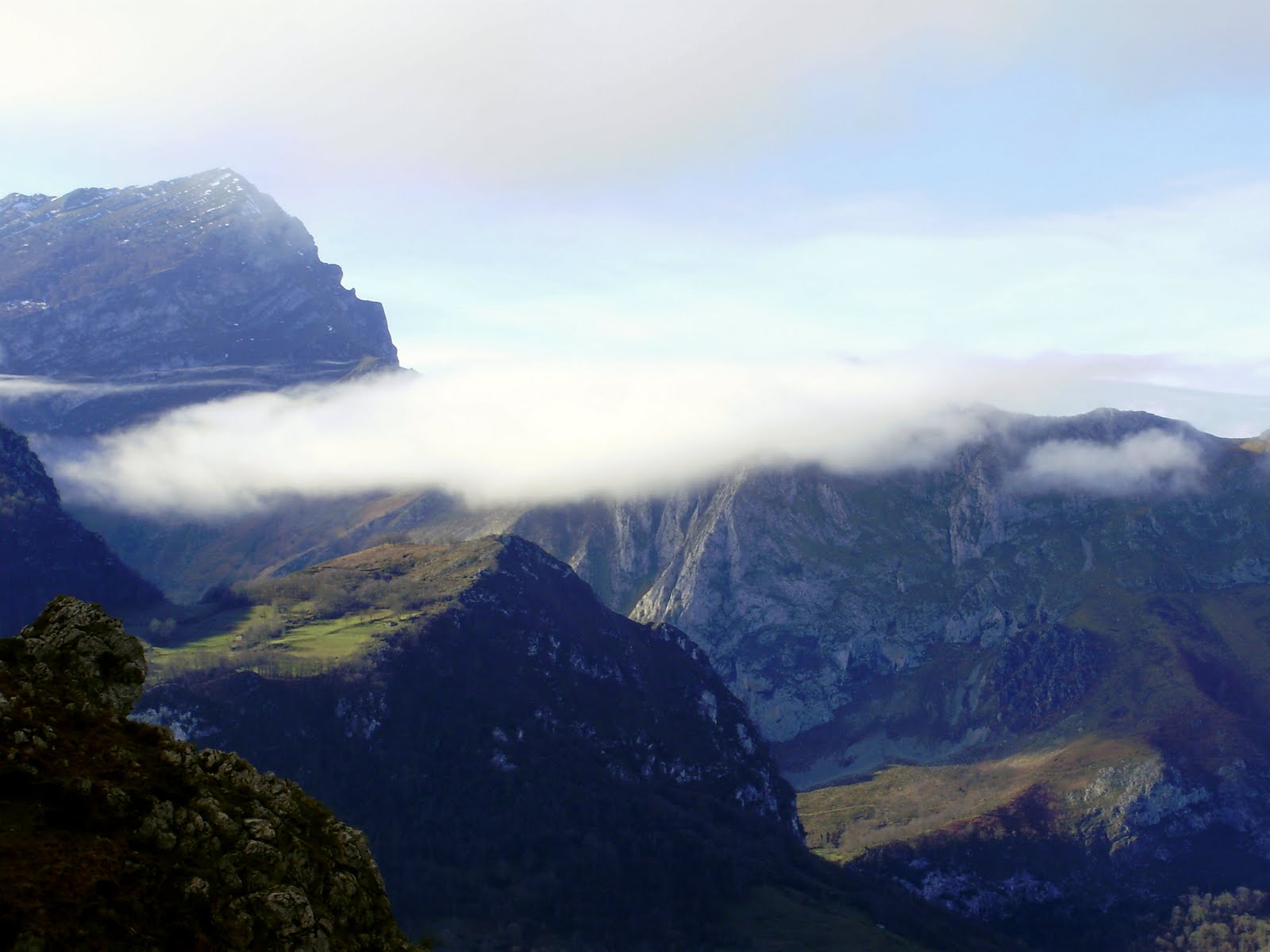 Un pequeño claro nos permite tener un vistazo fugaz sobre el valle de Angón y los murallones casi verticales que se precipitan desde el Cornión