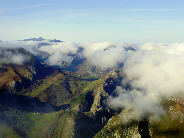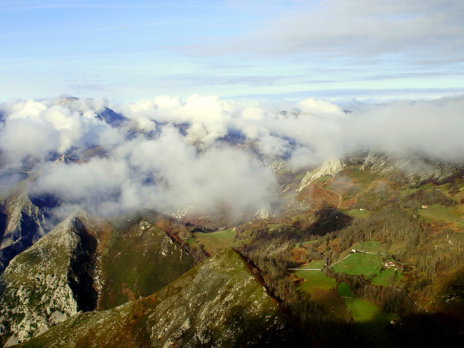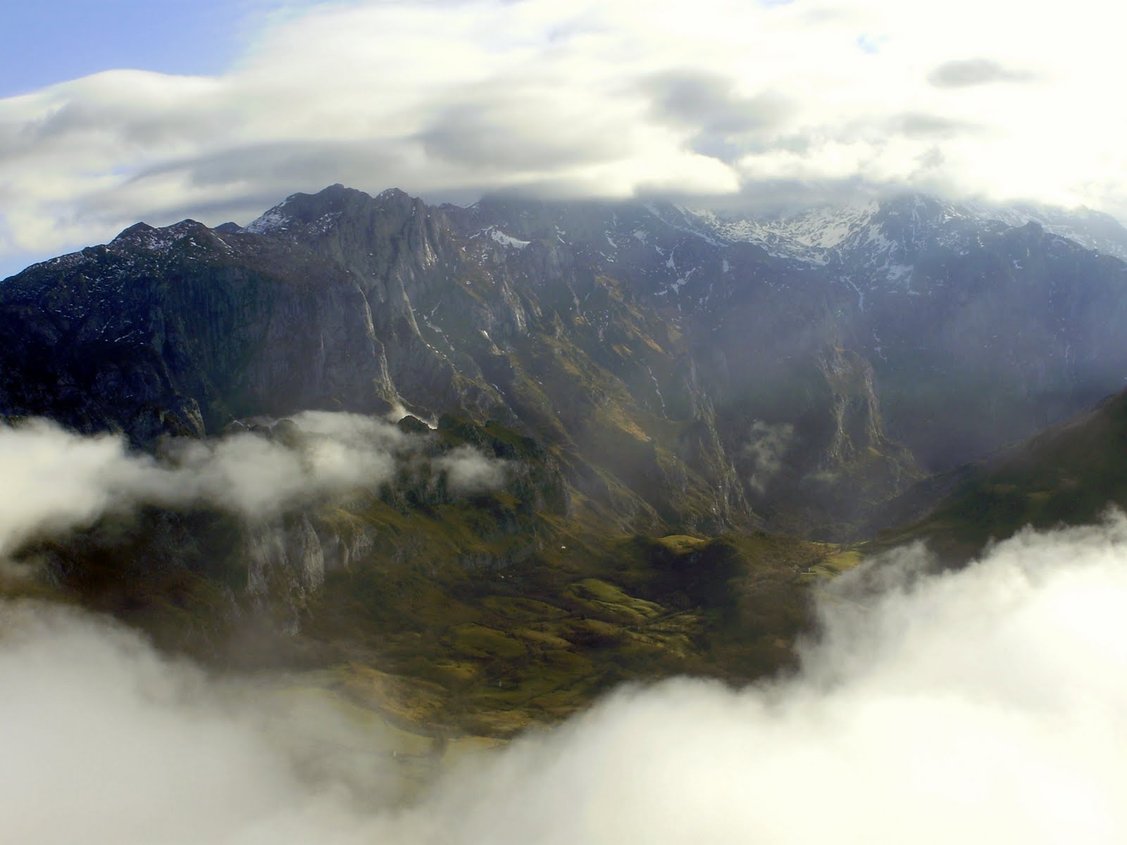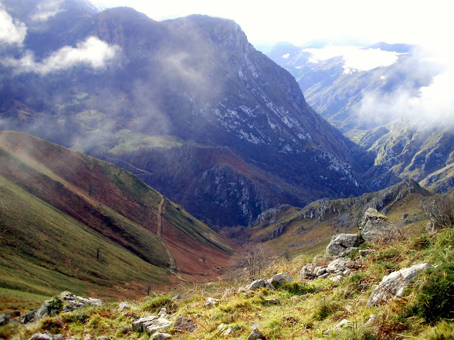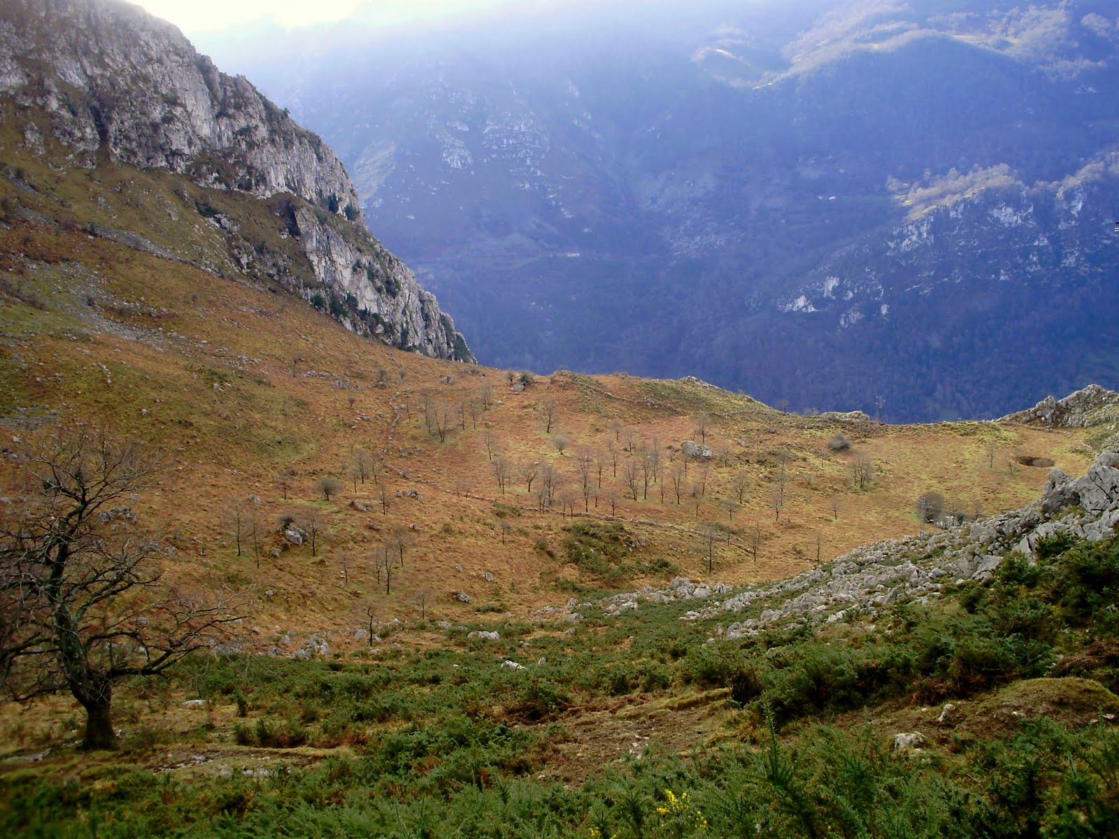 Un pequeño claro nos permite tener un vistazo fugaz sobre el valle de Angón y los murallones casi verticales que se precipitan desde el Cornión