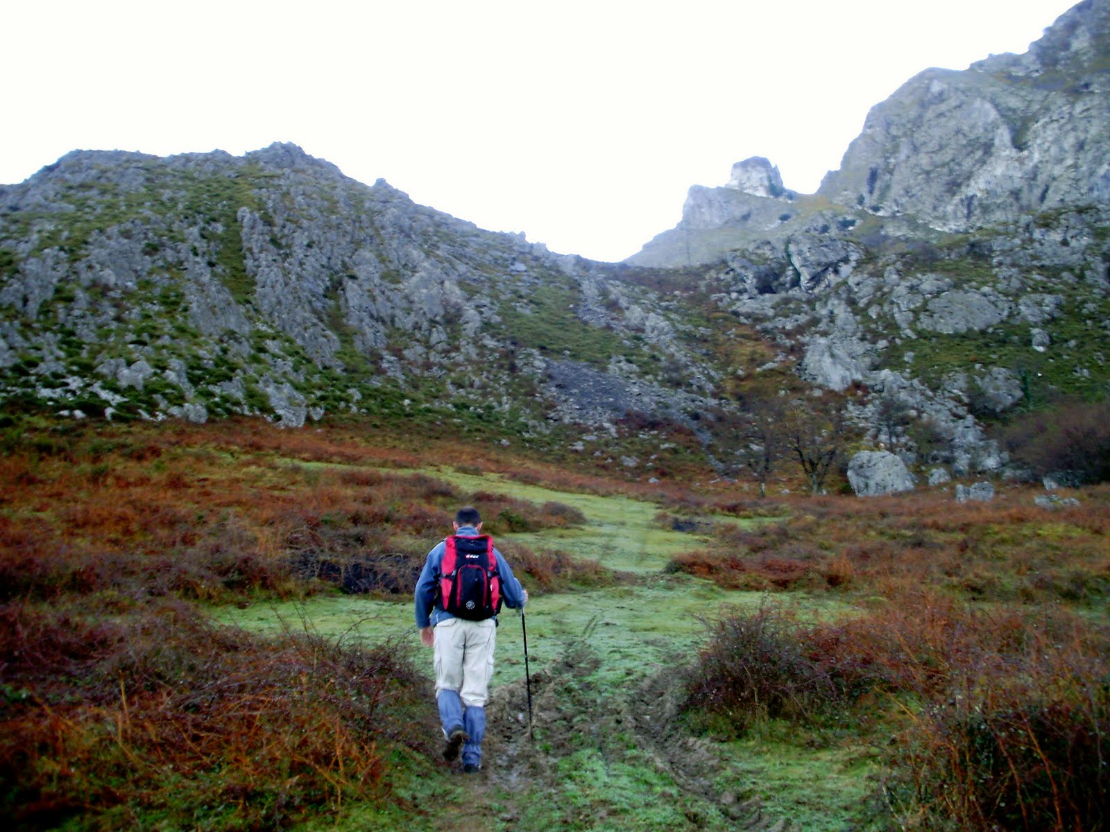 La pista muere en una llana pradería, enfrente tenemos una pindia ladera que vemos en la foto,  hacia ella nos dirigimos y al llegar a su arranque vemos claramente los restos de un sendero que nos sube hacia la parte alta.