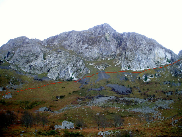 Desde la vega Colín observamos claramente la bonita silueta de la cumbre del Abogueru y visualizamos el itinerario de nuestro recorrido.  Para ello cruzaremos toda esta cara de la montaña pegados a sus contrafuertes rocosos para llegar a una jorcada situada a su derecha (Oeste) por la que traspasaremos a su vertiente oeste que se precipita sobre el valle del Sella. En la foto os marco el recorrido que realizamos.