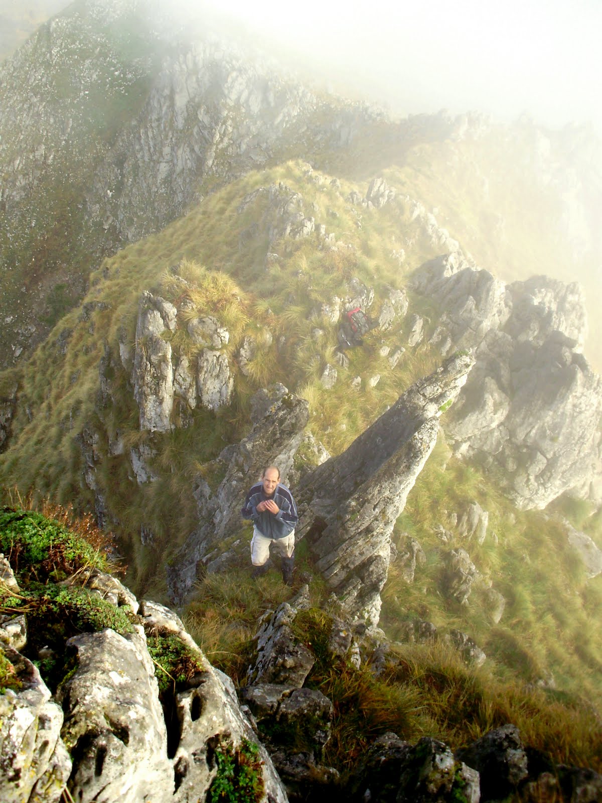 La cresta se sube su mayor parte siguiendo veredas dejadas por las cabras sin mayor problema hasta llegar al ultimo paso donde nos topamos con una pequeña trepada que hoy estaba algo delicada debido a encontrarse la caliza mojada