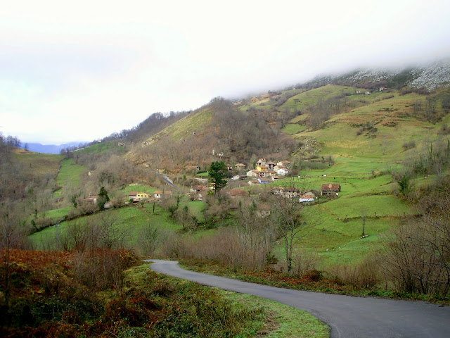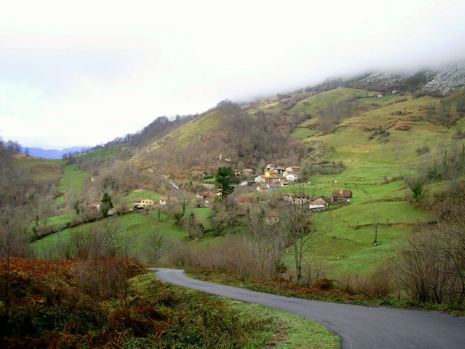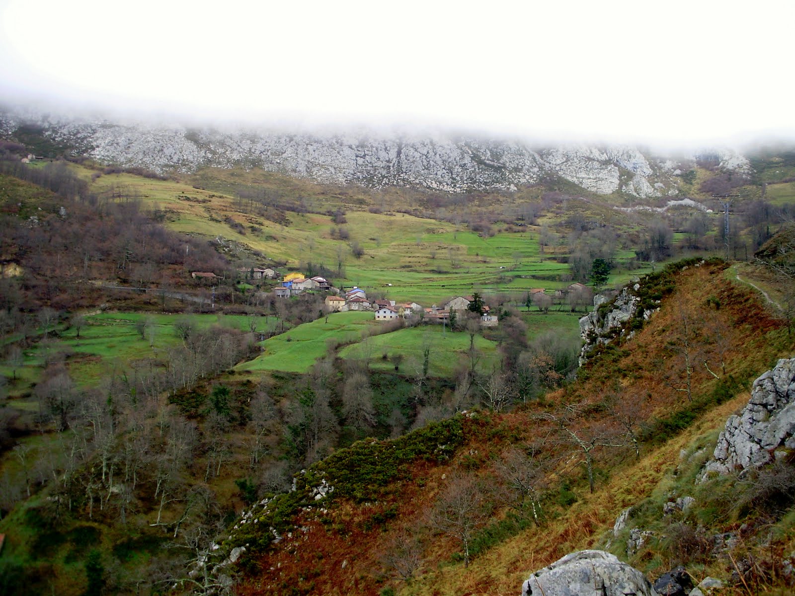 Desde el mirador contemplamos el pueblo de Amieva y al fondo la collada de Angón.