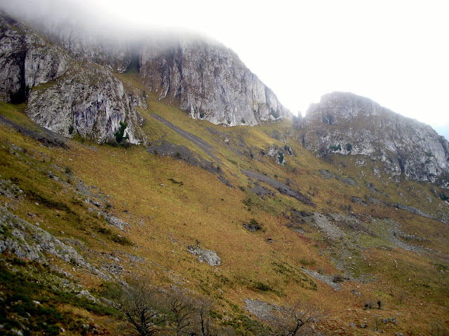 Lo primero que haremos es alzarnos hasta estar cerca de los murallones rocosos que forman esta vertiente. pero en lugar de hacerlo en dirección a donde está la jorcada lo haremos con tendencia hacia el lado contrario (Este) ya que por esta zona la pendiente es menos inclinada.