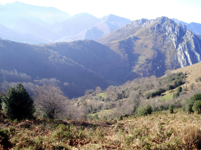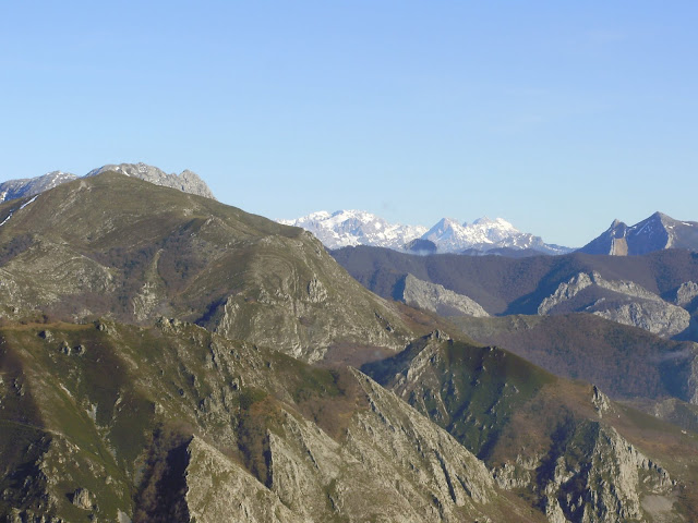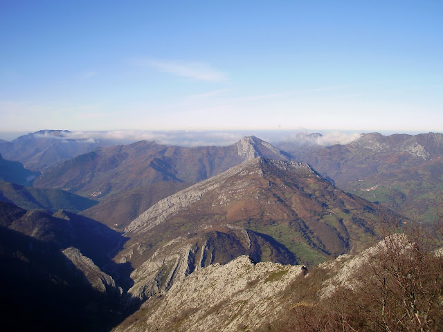 La ladera norteña está cubierta de hayas que sobresalen y que impiden la visión no obstante es buen balcón en las restantes direcciones. Vemos a la izda. el Pico La Senda, detrás asomando el Tiatordos; a la derecha el Collau del Zorru. Y al fondo Canto Cabronero y Peña Beza así como el Cornión.
