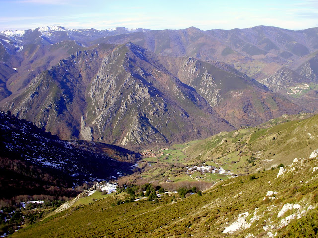 Unos metros valle abajo de donde está situada la cabaña entroncamos con el camino que habiamos llevado en el ascenso, desde aquí ya solo resta seguir el mismo camino hasta llegar al pueblo de Aguino, por encima del pueblo echamos un vistazo a las altas cumbres de Somiedo.