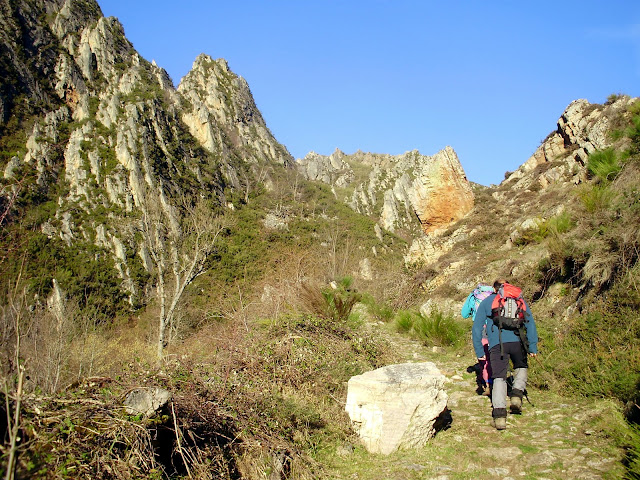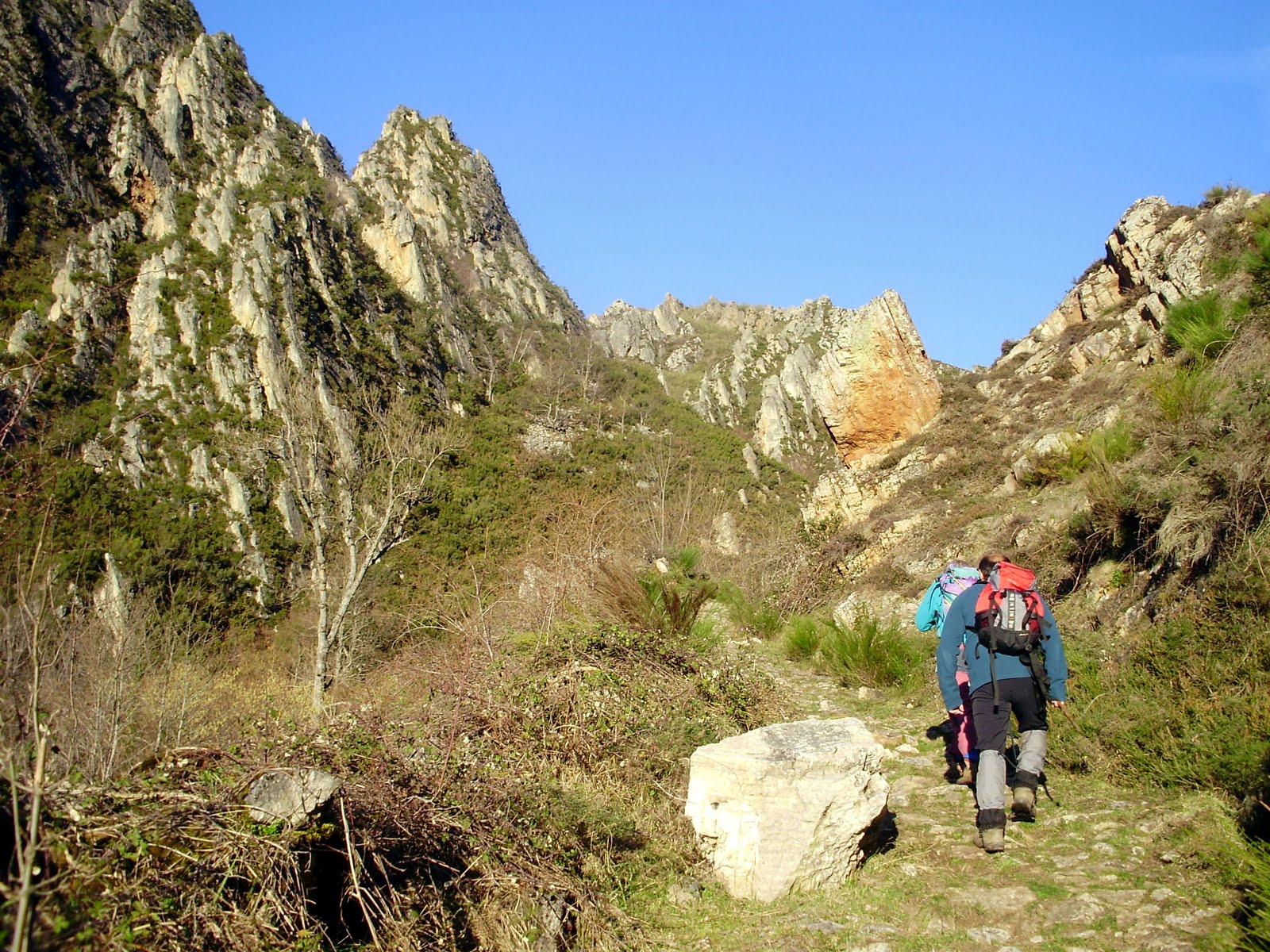 El camino pasa a la vertiente opuesta y ascendiende por zona rocosa superando los contrafuertes que se precipitan desde la cumbre del Carbachinos.