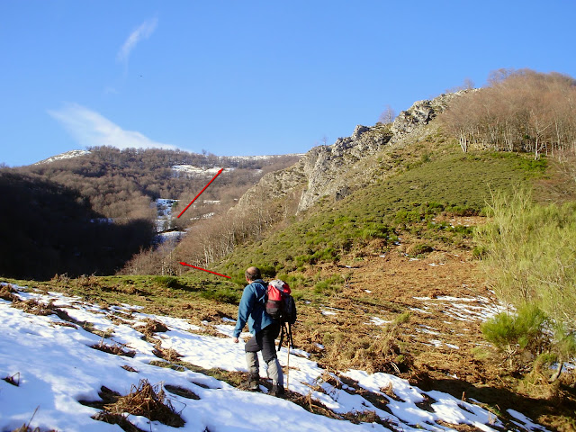 El sendero continua por el fondo del valle atravesando las praderías y cabañas de Reconco. Justo en el lugar que vemos en la foto un poco antes de llegar a una bonita cabaña de teito, hemos de abandonar el valle y ascender por la ladera izquierda en dirección sur (S). en la foto vemos el punto donde abandonamos el valle.