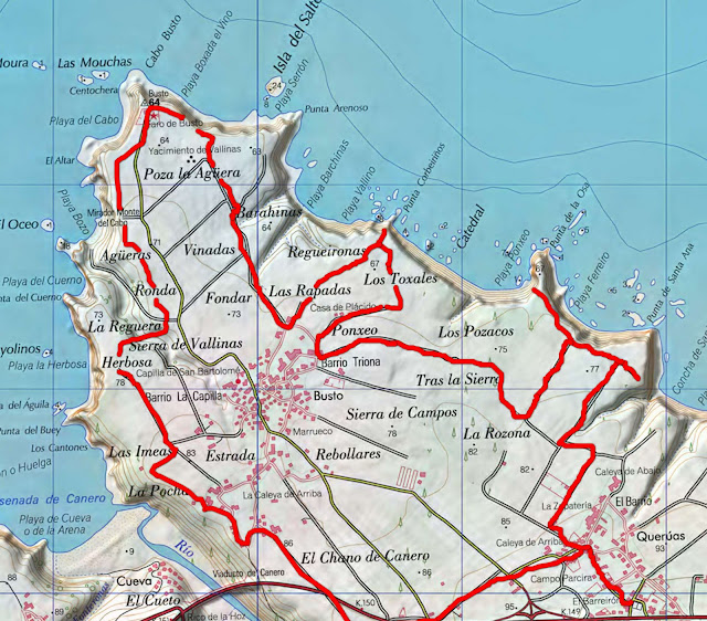 Volvemos sobre nuestros pasos para dirigirnos a las primeras casas de Busto, en este punto hemos de seguir las marcas del PR en dirección noroeste (NO) hacia el Cabo Busto. Antes de llegar pasamos por encima de la playa El Xerrón y el islote del Salto.