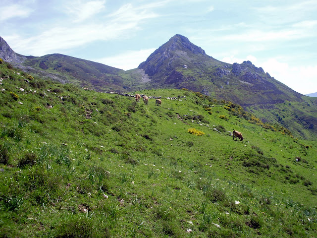 Finalmente llegamos a la zona de la Mortera de Ceberu donde el ganado pasta en zonas con desnivel más suave, al fondo vemos la collada El Visu y a su derecha la cumbre de la Peña El Castiellu.